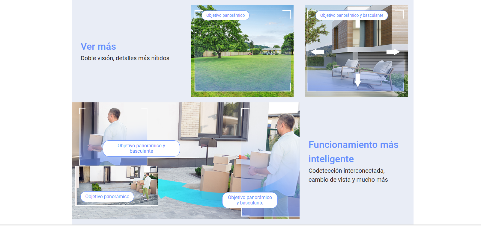 - Tecnología de Doble Lente: Cuenta con un lente gran angular de 2.8mm fijo y un teleobjetivo de 6mm con rotación motorizada de 360°. Ambas lentes trabajan en conjunto para monitorear un área general y seguir automáticamente cualquier movimiento detectado.